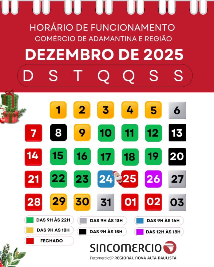O comércio de Adamantina funcionará em horário especial no feriado, das 9h às 15h, conforme o Sincomércio Nova Alta Paulista. A abertura das lojas ocorre em compensação ao dia 2 de janeiro, quando o setor permanecerá fechado.