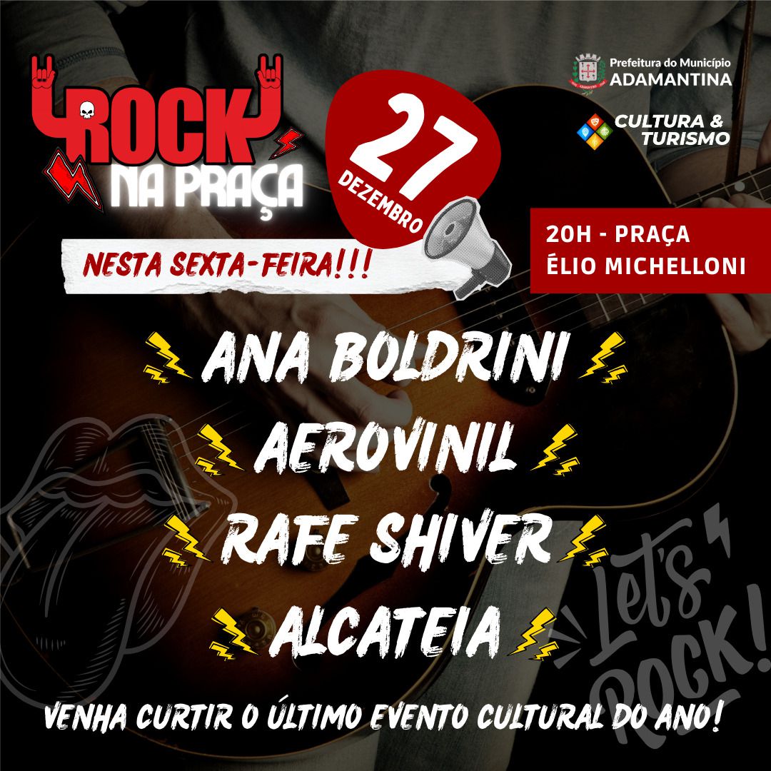 Com uma programação eclética, o Rock Na Praça traz cinco atrações que prometem agradar os mais variados gostos dentro do rock. Se apresentam Ana Boldrini, Banda Aerovinil, Rafe Shiver, Drop The Bomb e Banda Alcateia.