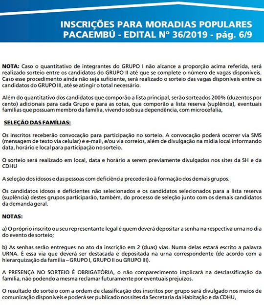 No item 8, sobre a “seleção das famílias”, do Edital nº 36/2019 publicado pela CDHU, traz informações fundamentais para os candidatos convocados para o sorteio: “O próprio inscrito ou seu representante legal é quem deverá depositar a senha na respectiva urna no dia do evento de sorteio; Em uma das senhas estará escrito a palavra URNA, então será essa via que deverá ser destacada e depositada na urna correspondente (de acordo com a hierarquização da família – Grupo I, Grupo II ou Grupo III)”.