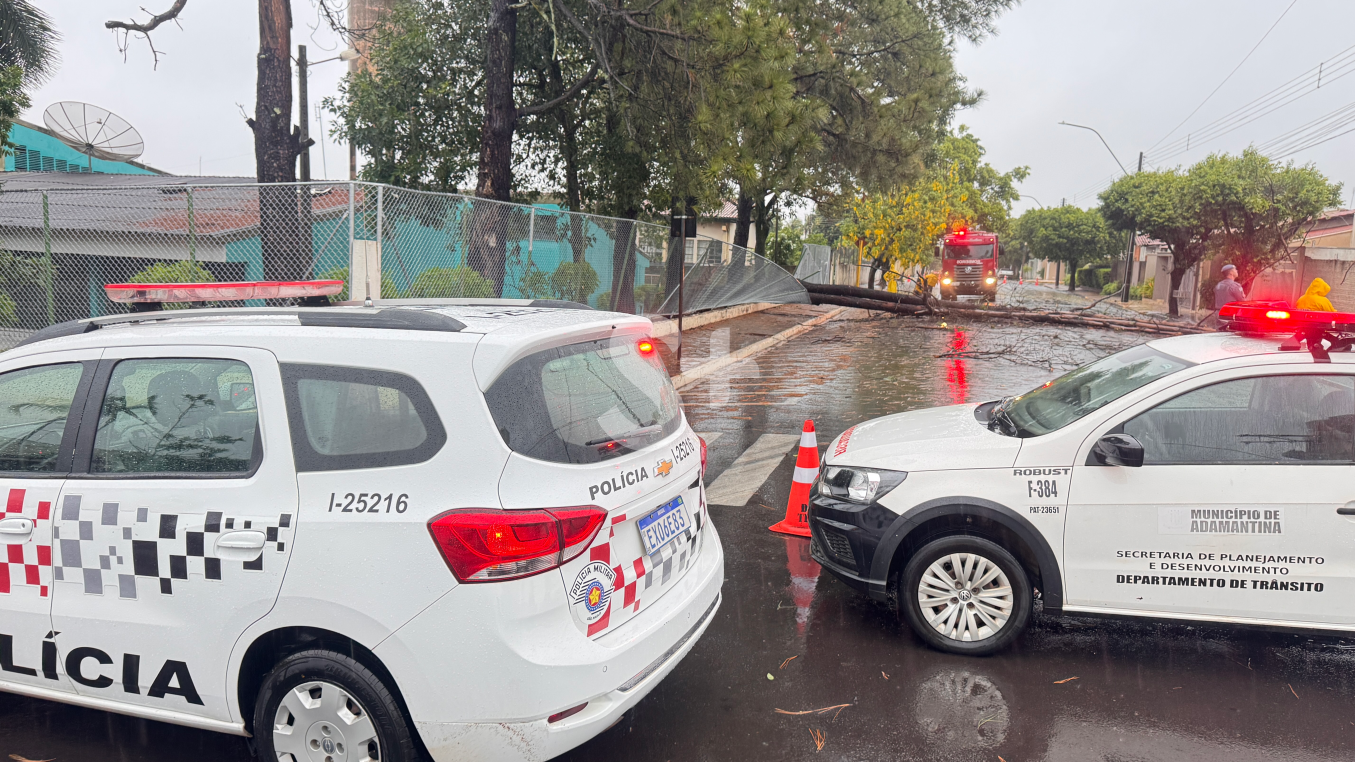 Uma árvore localizada na área interna da Escola Estadual Helen Keller caiu na manhã deste sábado (13), durante a chuva registrada em Adamantina, atingindo a Alameda Jarbas Bento da Silva e provocando a interdição temporária da via. O tráfego só foi liberado após a atuação conjunta do Corpo de Bombeiros e de equipes da Prefeitura. A Polícia Militar também compareceu ao local.