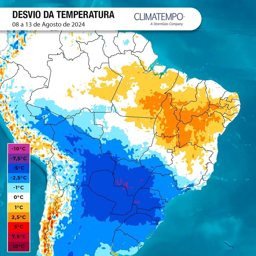 Ainda de acordo com o Climatempo, na sexta-feira (9), esse ar frio avança para São Paulo ao longo do dia. Com o deslocamento da frente fria e a circulação de ventos transportando mais umidade do mar, pode ocorrer um pouco de chuva no sul e leste do estado, pegando inclusive o litoral, e a temperatura deve cair bastante.