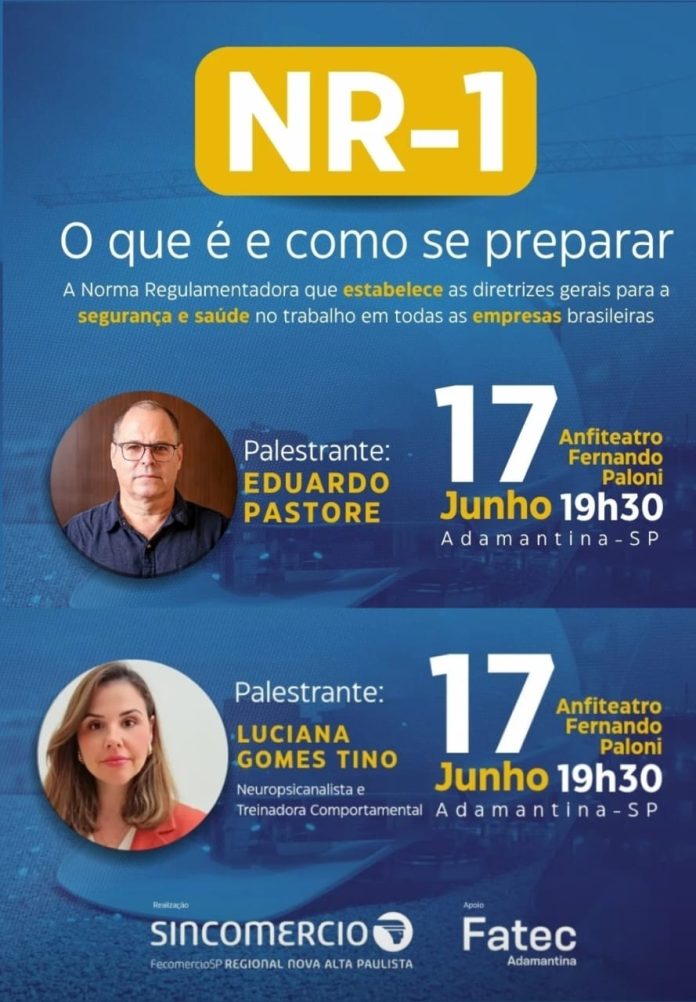 Com o objetivo de apoiar o empresariado neste momento, o Sincomercio Nova Alta Paulista — em parceria com a FecomercioSP (Federação do Comércio de Bens, Serviços e Turismo do Estado de São Paulo) e com o apoio da Fatec de Adamantina (Faculdade de Tecnologia) — promove nesta terça-feira (17) a palestra “NR-1 — O que é e como se preparar?”. O evento é gratuito e será realizado às 19h30, no Anfiteatro Fernando Paloni, em Adamantina. As inscrições estão disponíveis online e as vagas serão limitadas.