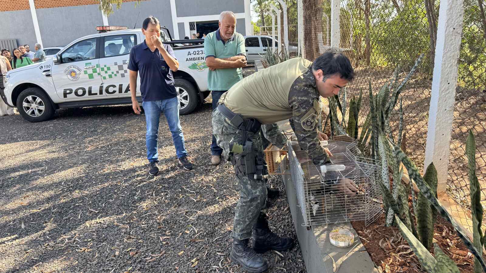 Na sequência houve soltura de passados resgatados pela PM Ambiental em operações realizadas na região, agora devolvidos à natureza. Autoridades e participantes do evento de abertura fizeram as solturas. As gaiolas foram destruídas no local pelos policiais.