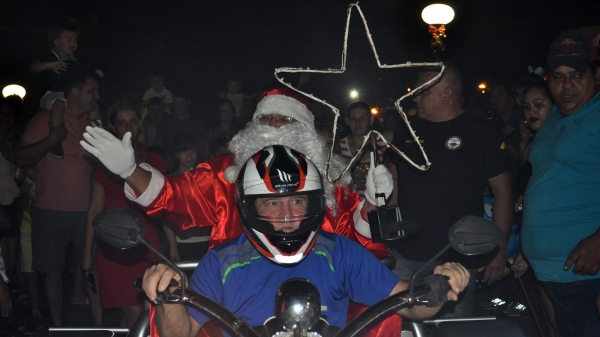 De triciclo, a chegada do bom velhinho parou o centro da cidade. No momento em que o Papai Noel desceu da moto, as crianças o cercaram e todos queriam fotos.