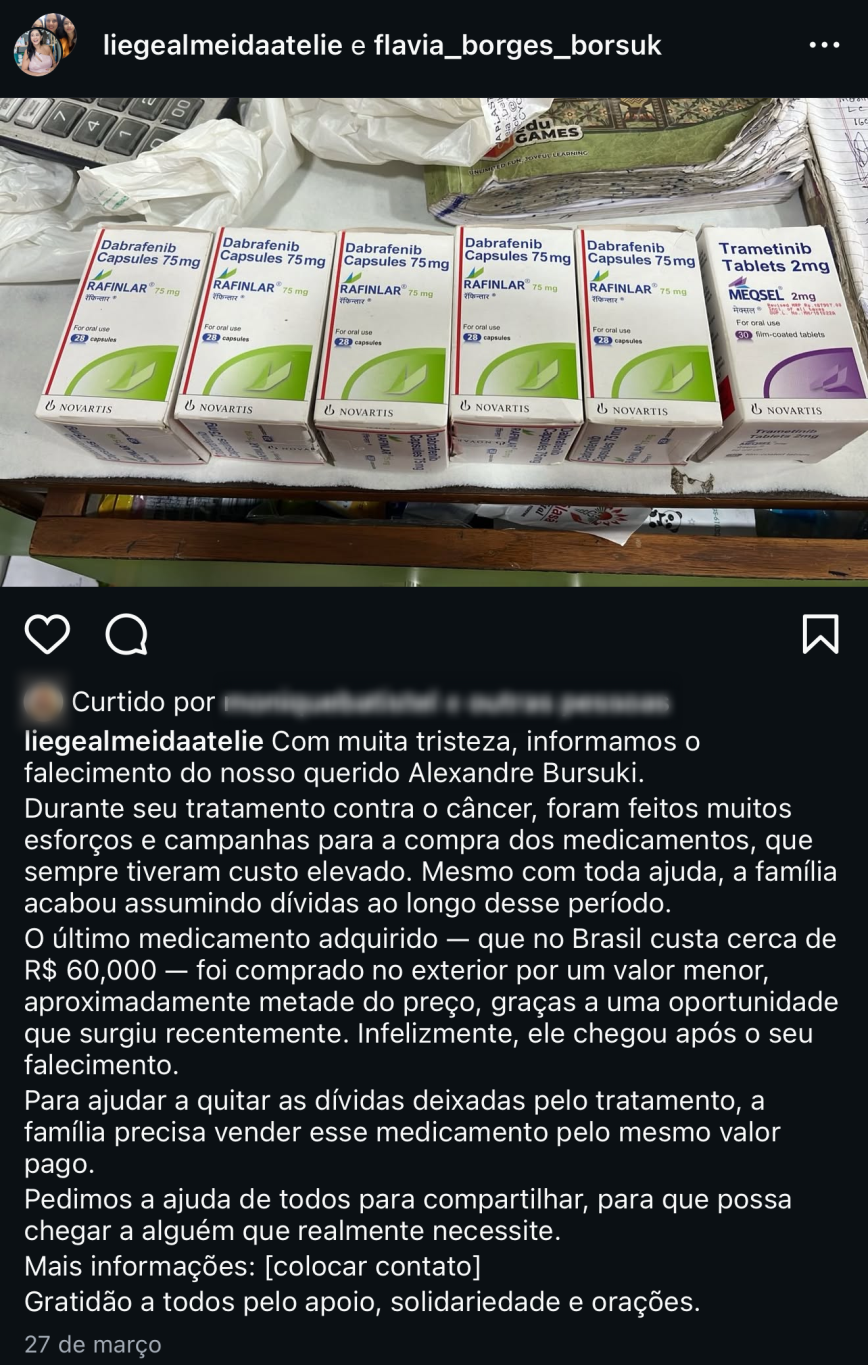 Uma publicação no Instagram, datada de 27 de março, apresenta imagens dos medicamentos e traz o apelo da família: “Pedimos a ajuda de todos para compartilhar, para que essa informação chegue a quem realmente necessite”.