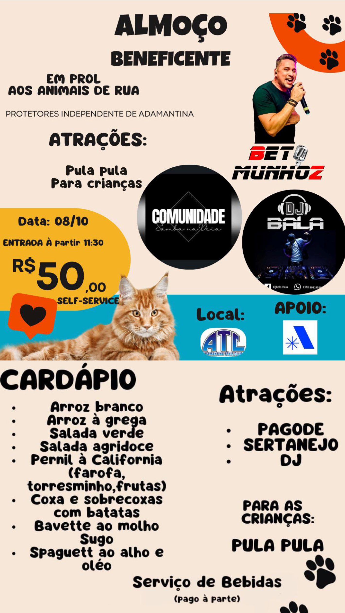 Para reunir recursos financeiros para cuidar de animais de rua em Adamantina, um grupo de protetores independentes realiza neste domingo (8) um almoço beneficente. A ação acontece a partir das 11h30 no Adamantina Tênis Clube (ATC).