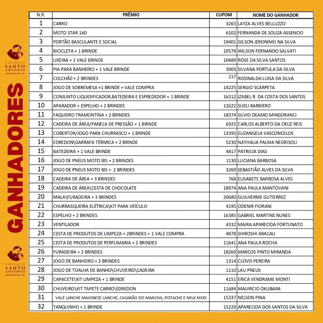 A Paróquia Santo Antônio, de Adamantina, fez na quinta-feira (20) a entrega dos dois principais prêmios do sorteio realizado no sábado anterior, 15, durante a Festa do Padroeiro, em sua 32ª edição. As festividades aconteceram no Recinto Poliesportivo.