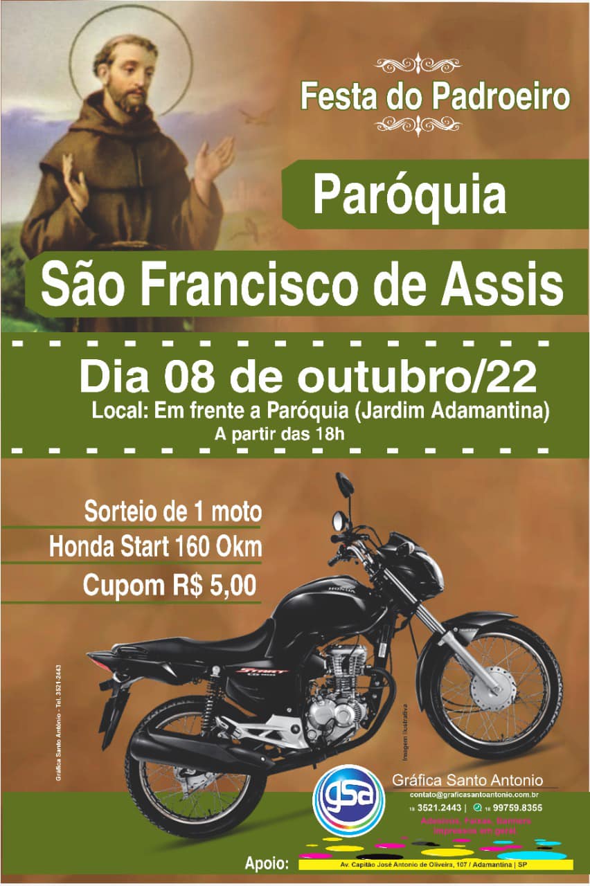 A Paróquia São Francisco de Assis, em Adamantina, promove neste sábado (8) a Festa do Padroeiro, com quermesse e sorteio de uma moto zero quilômetro. As festividades acontecem em frente à Igreja, no Jardim Adamantina, com início às 18h. A data dedicada a São Francisco de Assis é celebrada nesta terça-feira (4).