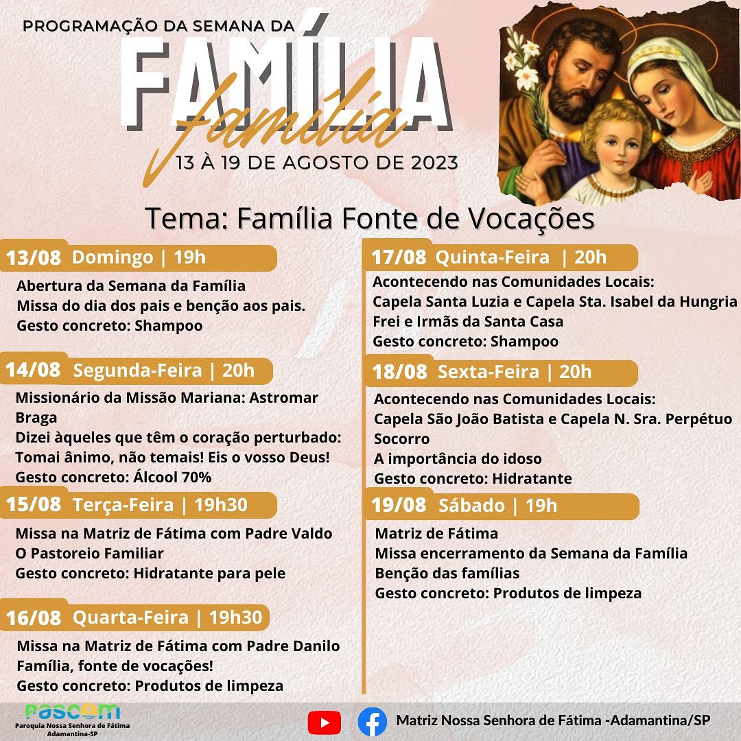 Em Adamantina a Semana da Família é celebrada nas três paróquias: Santo Antônio, Nossa Senhora de Fátima e São Francisco de Assis. Veja a programação de cada uma das três comunidades: