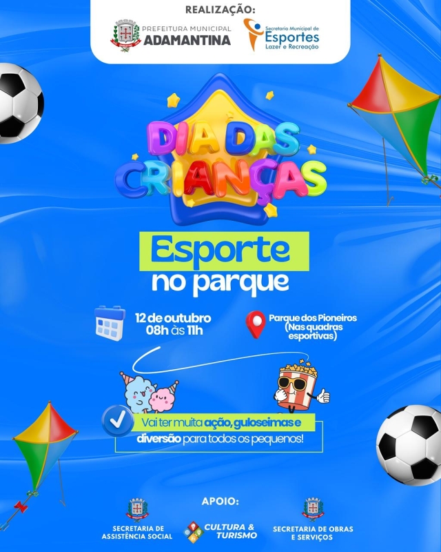 Domingo (12), a partir das 8h, a Prefeitura de Adamantina por meio das secretarias de Cultura e Turismo e de Esportes, Lazer e Recreação (Selar), promoverá atividades para celebrar o “Dia das Crianças” no Parque dos Pioneiros.