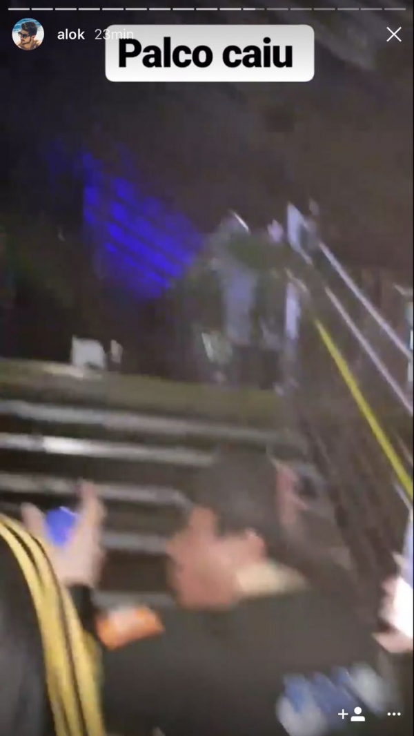 Do camarim, Alok Disse que a estrutura do palco caiu. Depois reaparece para o público, interage e aguarda a decisão dos organizadores e das autoridades.