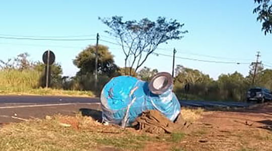 A peça cai pela lateral da carroceria do caminhão, no acostamento, quando o mesmo passava pela rotatória. (Continua após a publicidade...)