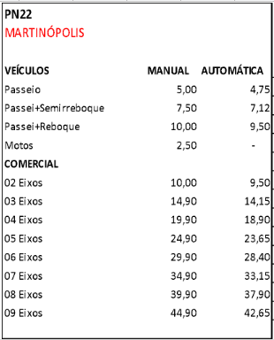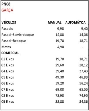 Veja os novo valore que irão vigorar, a partir de sábado, para a Rodovia Comandante João Ribeiro de Barros (SP-294), nas praças de Garça, Oriente, Parapuã, Inúbia Paulista, Pacaembu e Santa Mercedes: