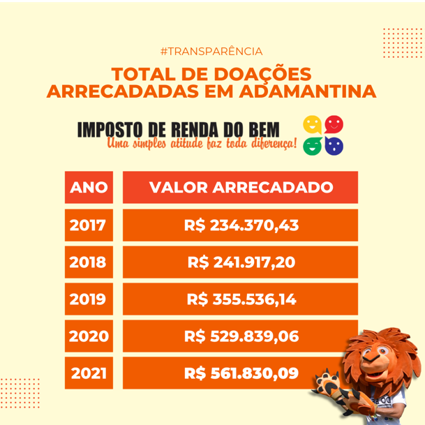 A Campanha Imposto de Renda do Bem, desenvolvida pelo Conselho Municipal dos Direitos da Criança e do Adolescente (CMDCA) de Adamantina e pelo Conselho Municipal dos Direitos da Pessoa Idosa (CMDI), com apoio da Secretaria Municipal de Assistência Social e da Prefeitura de Adamantina, obteve pelo segundo ano consecutivo uma arrecadação de mais de meio milhão de reais em doações.