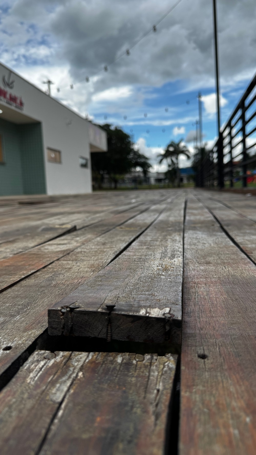 Peças de madeira estão se desprendendo do deck no espaço gastronômico formado por quiosques de alimentação no Parque dos Pioneiros, em Adamantina. O espaço foi construído com recursos públicos pelo programa Município de Interesse Turístico (MIT) e contrapartida municipal.