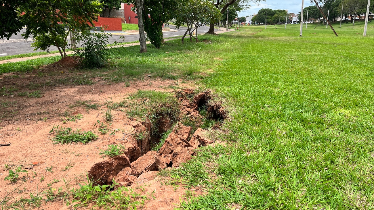 Pequena cratera aparece no Parque dos Pioneiros; Secretaria de Obras monitora e descarta perigo
