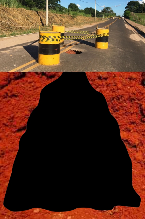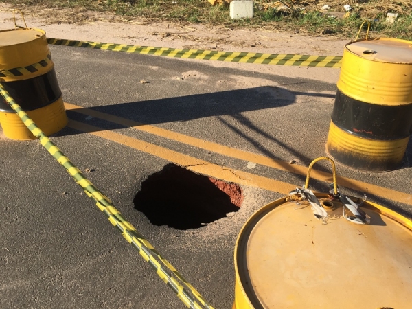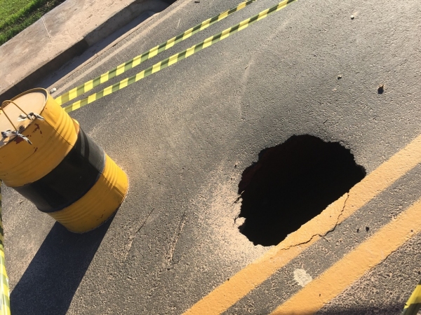 O buraco, na superfície da pista, tem cerca de 60 centímetros de diâmetro. Porém, o pior está escondido: uma cratera escavada pelas águas, supostamente por vazamento ou insuficiência nos tubos de drenagem que passam pelo local, deixa o local ainda mais perigoso.