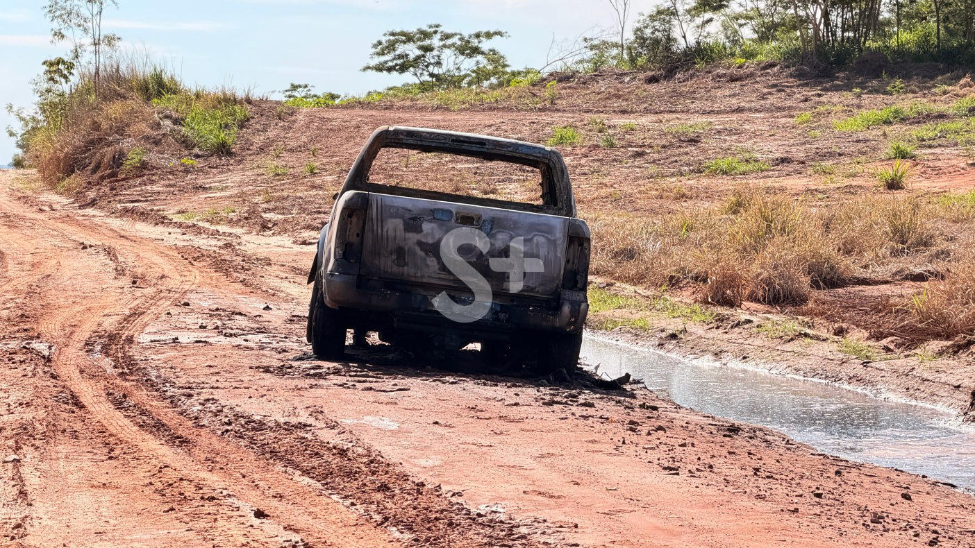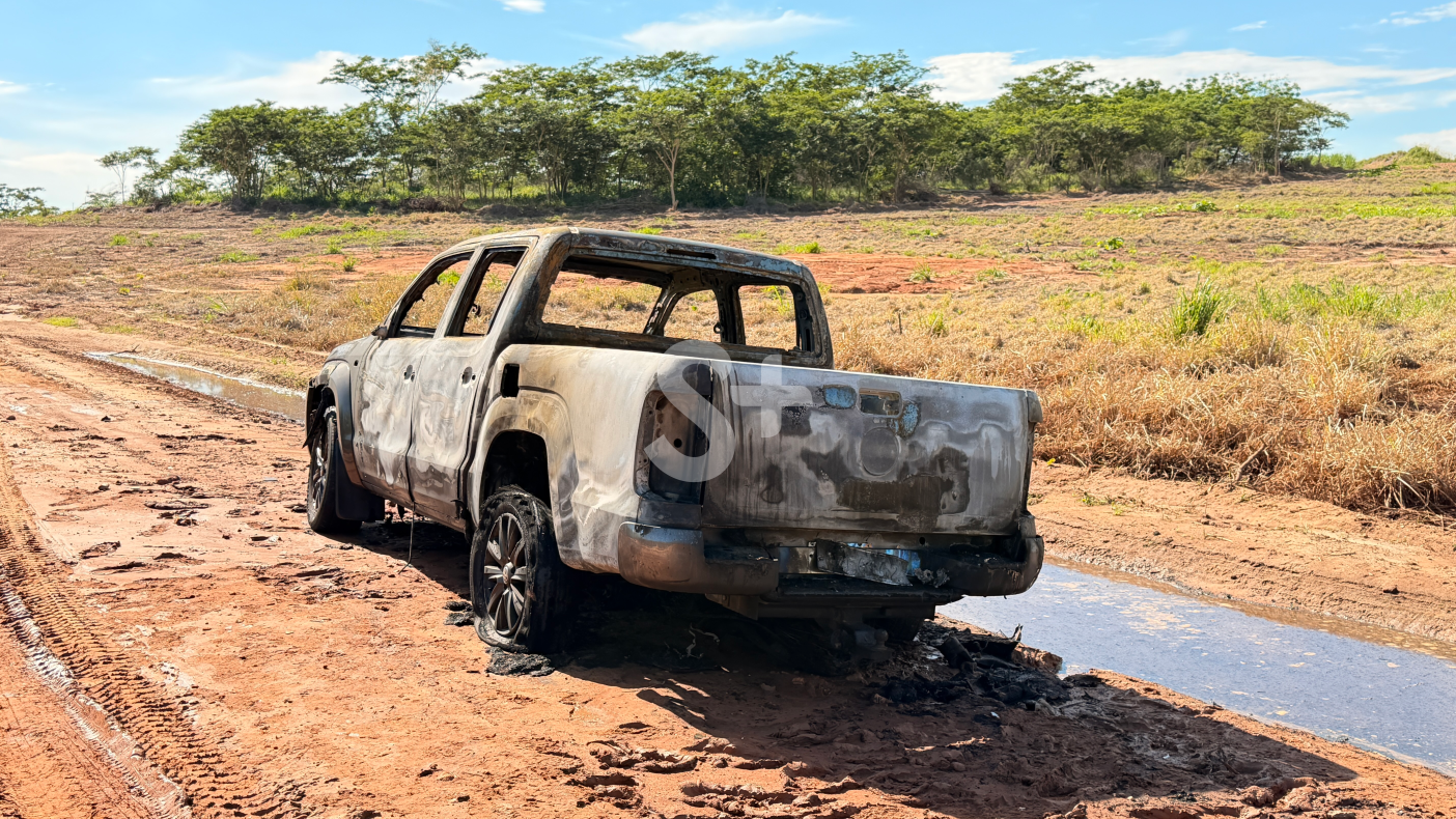 Incêndio destruiu a picape em estrada de terra na altura do km 12 da Rodovia Plácido Rocha.