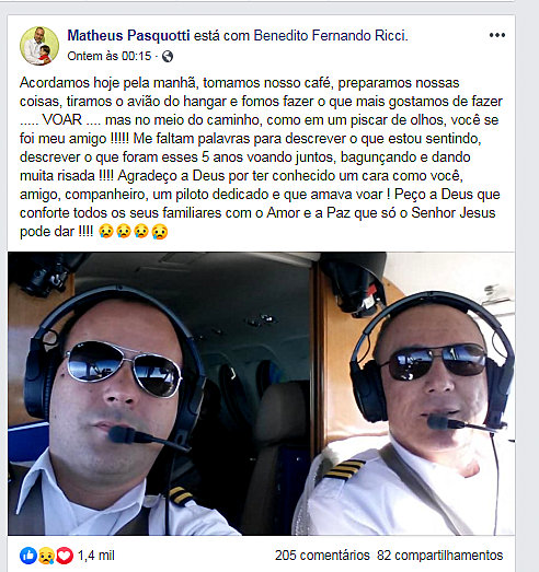 Pasquotti, que mora em Santa Bárbara do Oeste, publicou nas redes sociais uma homenagem ao amigo. No texto relembra que foram cinco anos voando juntos, um período de muita amizade e alegria e que, em um "piscar de olhos", no meio da viagem, o amigo "se foi".