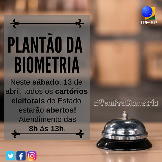 O plantão do dia 13 de abril envolve todos os 393 cartórios eleitorais do Estado. Na capital e em outros 60 municípios, onde a biometria ainda não é obrigatória, o TRE-SP também recomenda ao eleitor que antecipe o procedimento, para seu conforto e tranquilidade.