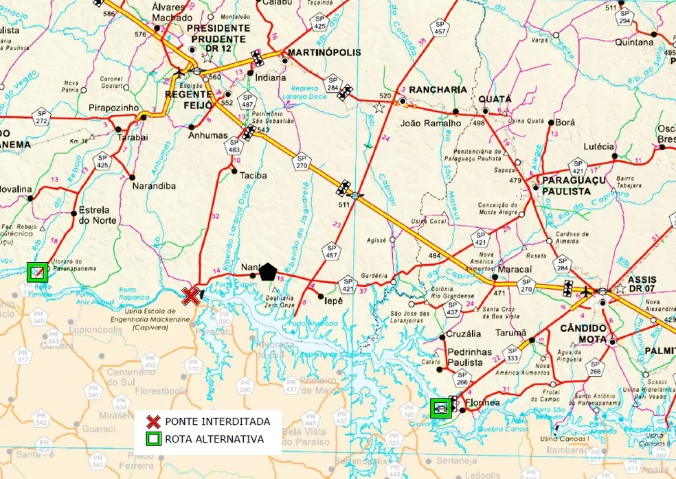 Durante a interdição, segundo orienta o DER, o usuário deverá utilizar rotas alternativas, através das rodovias Assis Chateaubriand (SP 425), pelo km 523, em Pirapozinho, próximo ao distrito de Itororó do Paranapanema, na região de Presidente Prudente, e pela Rodovia Miguel Jubran (SP 333), pelo km 451, em Florínea, na região de Assis.
