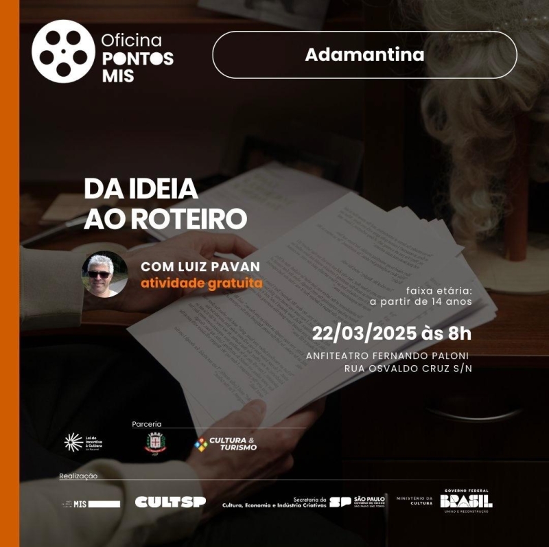 Por ser ponto do Museu da Imagem e do Som de São Paulo (MIS), Adamantina recebe neste sábado (22), a oficina “Da Ideia ao Roteiro” a partir das 8h no Anfiteatro Fernando Paloni. A participação é gratuita e podem participar pessoas que tenham a partir de 14 anos.