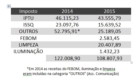 No ano de 2014, nos meses de setembro e outubro, foram arrecadados R$ 122.008,90 referentes à dívida ativa do município. Cabe lembrar que no ano passado não houve PPI. Em 2015, a Prefeitura e a Câmara Municipal aprovaram o plano para equilibrar as contas da Administração Pública, mas não deu o resultado esperado. Na verdade, a arrecadação no mesmo período caiu para R$ 108.807,43. O déficit foi de R$ 13.201,47.