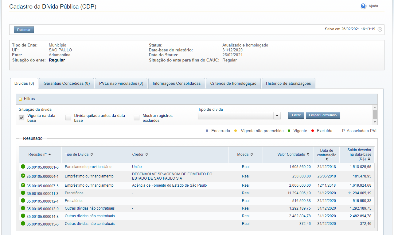 Segundo consulta pública ao Cadastro da Dívida Pública (CDP) no Sistema de Análise da Dívida Pública, Operações de Crédito e Garantias da União, Estados e Municípios (Sadipem), do Tesouro Nacional, o saldo devedor da pública municipal de Adamantina, hoje, é de R$ 18.905.481,84, a maioria proveniente de precatórios (R$ 11.810.595,57).
