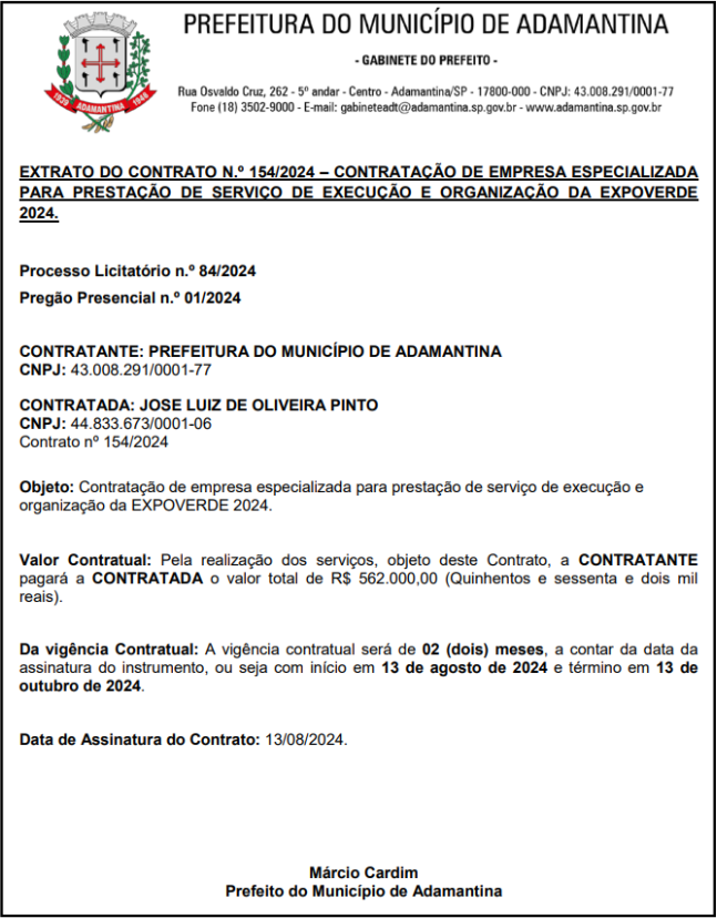 A Prefeitura de Adamantina contratou por R$ 562.000,00 a empresa que irá promover a infraestrutura temporária e organização da ExpoVerde 2024 (32ª Feira do Vede e Exposição Agropecuária, Comercial e Industrial de Adamantina, que acontece de 3 a 8 de setembro, no Recinto Poliesportivo.