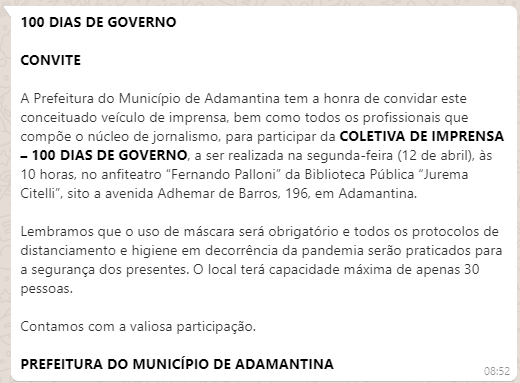 A Prefeitura de Adamantina emitiu comunicado à imprensa, e também dirigido aos vereadores, para uma coletiva à imprensa, em formato presencial, para apresentar dados referentes aos 100 dias de governo do segundo mandato do prefeito Márcio Cardim (DEM). O evento está marcado para ocorrer na próxima segunda-feira (12), às 10h, no anfiteatro da Biblioteca Municipal.