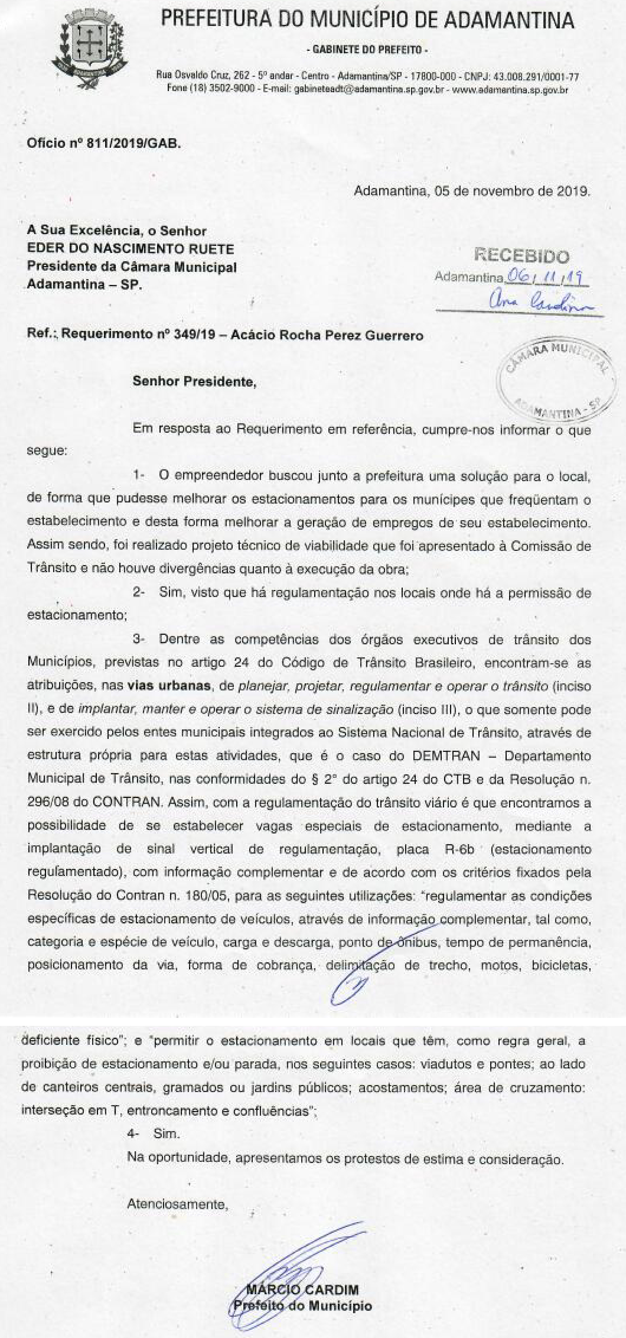 Os quatro pontos cobrados pelo vereador no Requerimento foram respondidos pela Prefeitura por meio do Ofício Nº 811/2019/GAB, de 5 de novembro de 2019, assinado pelo prefeito Márcio Cardim.