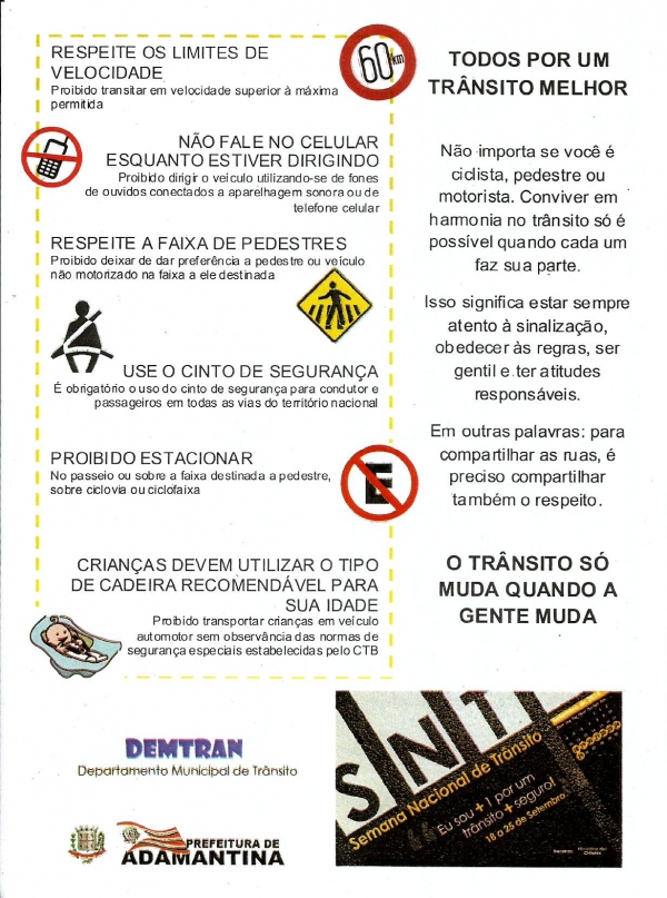 O 25º Batalhão da PM de Adamantina em parceria com a Prefeitura do Município de Adamantina promovem atividades de mobilização da Semana Nacional do Trânsito, que acontece entre 18 e 25 de setembro em todo o território brasileiro. A Polícia Militar visitará as escolas municipais, estaduais e particulares para a divulgação da mensagem da Semana Nacional do Trânsito, a qual tem como tema "Eu sou + 1 por um trânsito + seguro!”.