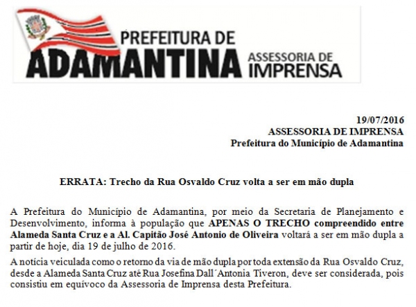 A Prefeitura de Adamantina errou a divulgar nota à imprensa, ontem (18), informando sobre a reintrodução de mão única na Rua Osvaldo Cruz, trecho que há cinco anos é mão única, nas quadras entre a Alameda Santa Cruz e a Rua Josefina Dall´Antônia Tiveron.