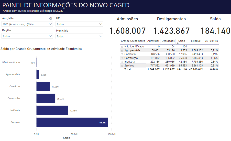 Em nível Brasil, o saldo do emprego com carteira assinada em março de 2021 ficou positivo em 184.140 postos de trabalho.