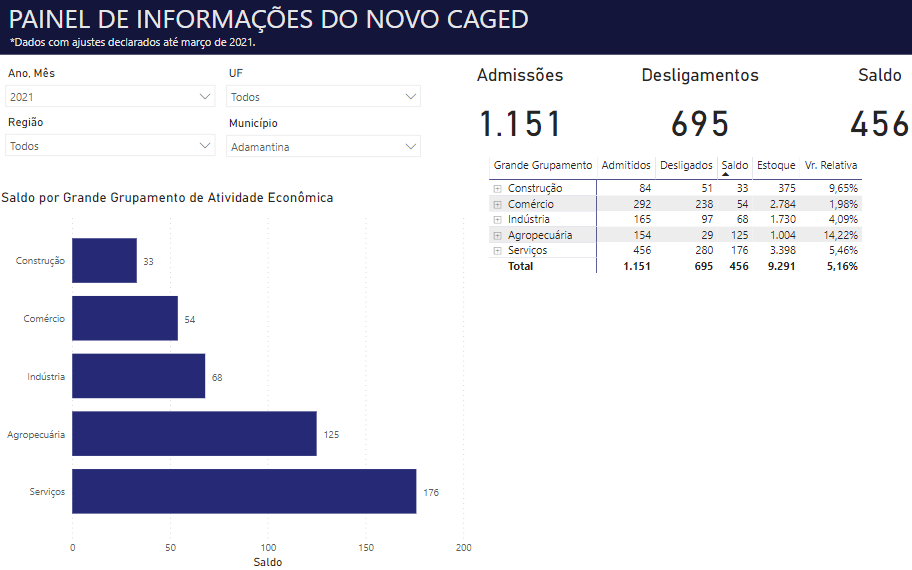 O saldo do emprego com carteira assinada em Adamantina, nos meses de janeiro, fevereiro e março, ficou positivo em 456 empregos. Nesses três meses do ano, foram 1.151 admissões e 695 desligamentos formais na cidade, o que revela o saldo positivo de postos de trabalho.