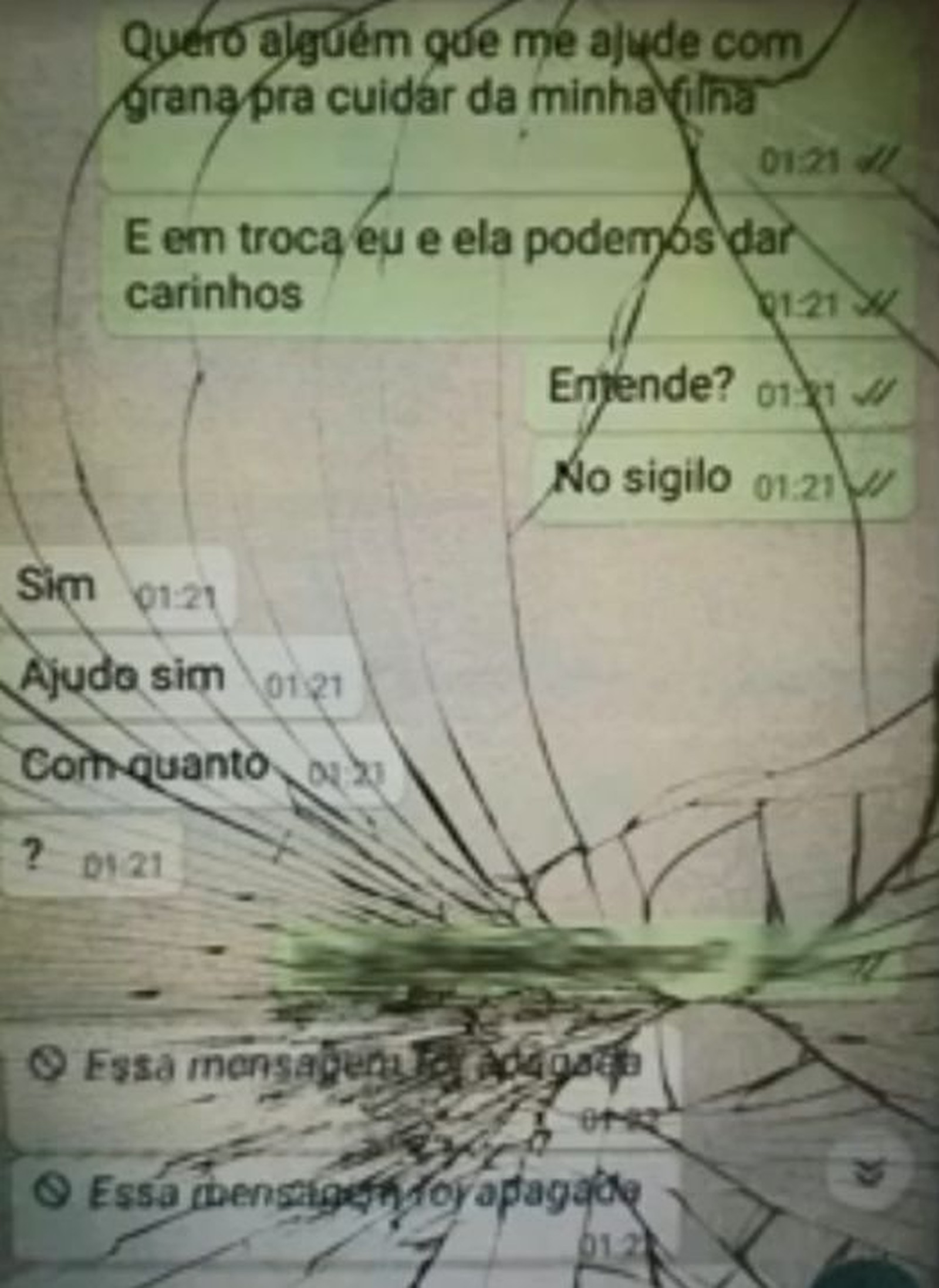 Segundo o texto da mensagem localizada no aplicativo de conversas, o professor faz a proposta e pede sigilo. “Quero alguém que me ajude com a grana para cuidar da minha filha. E em troca eu e ela podemos dar carinhos. Entende? Em sigilo”, diz a mensagem.