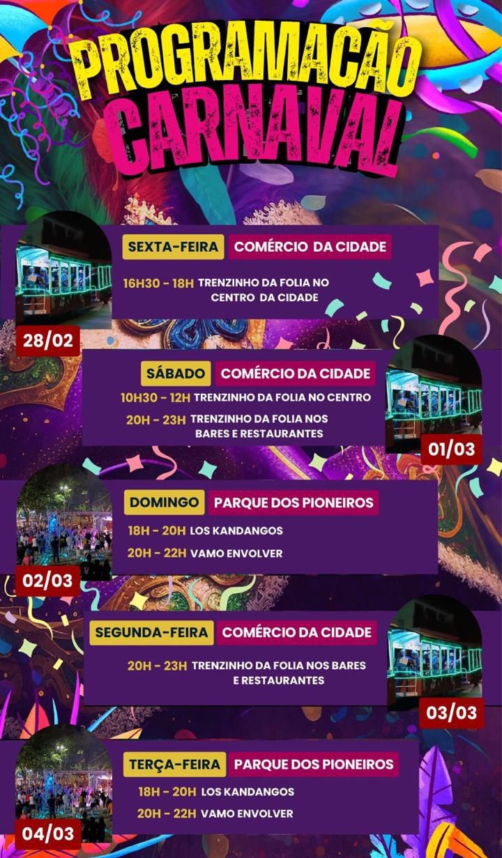 Para animar os foliões com as tradicionais marchinhas de carnaval, o “trenzinho da folia” vai percorrer os bares e restaurantes da cidade das 20h às 23h no sábado (1) e na segunda-feira (3). Além disso, a programação também será realizada no Parque dos Pioneiros no domingo (2) e na terça-feira (4). Subirão ao palco tanto no domingo (2) quanto na terça-feira (4), Los Kandangos das 18h à 20h e Vamo Envolver das 20h às 22h.