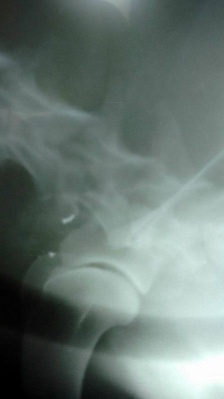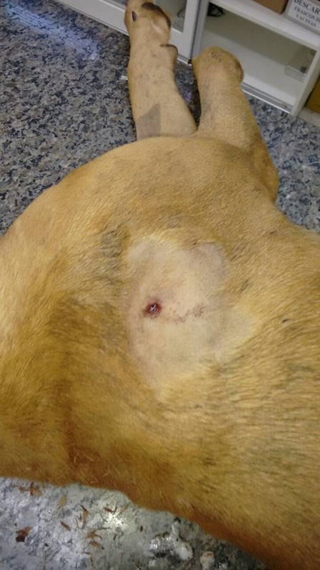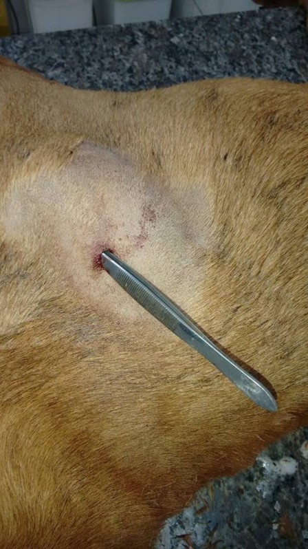 Segundo o veterinário, o projétil é de pequeno calibre, provavelmente um chumbo de espingarda ou se trata de um projétil de calibre 22, porém, se fragmentou com o impacto e continua alojado na paleta do cão.