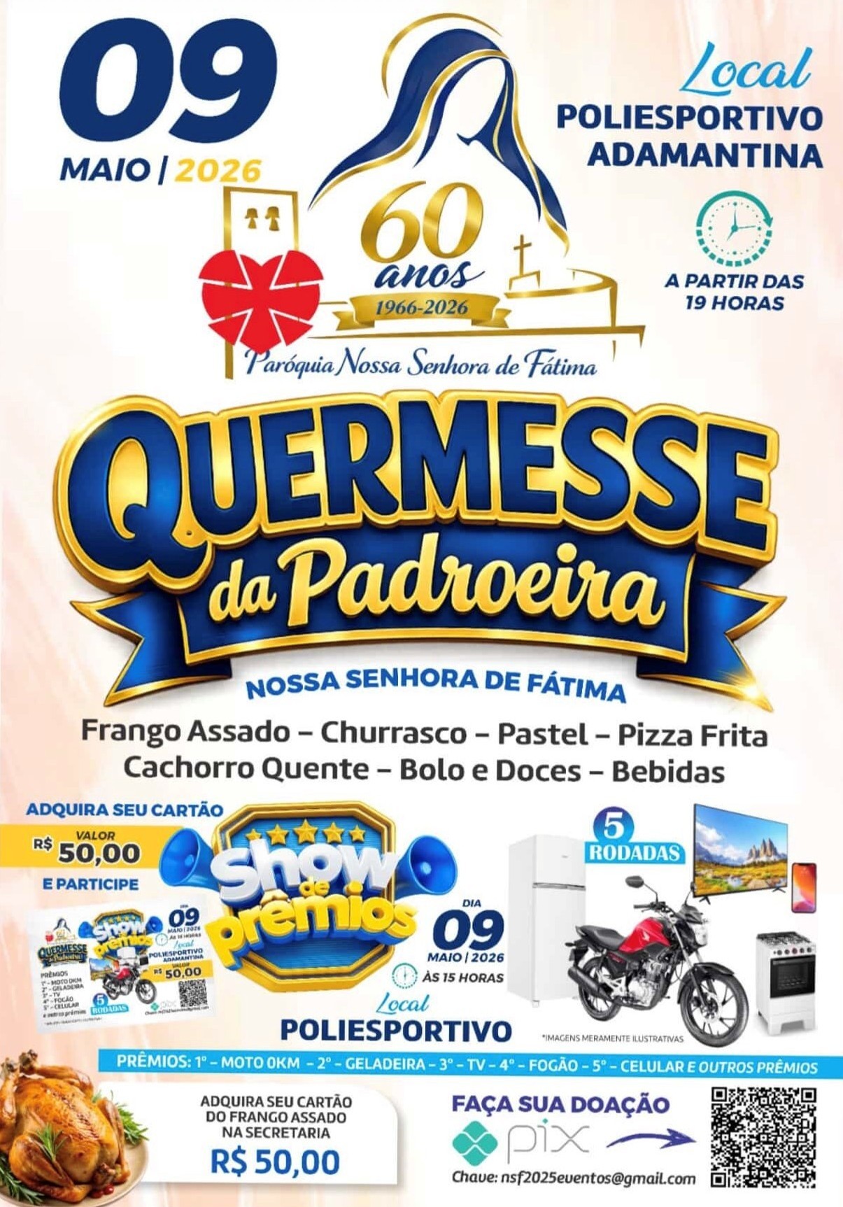 O evento será realizado no dia 9 de maio, no Poliesportivo de Adamantina, com início a partir das 19h. A programação reúne fé, confraternização e solidariedade, características que fazem da quermesse um dos eventos mais aguardados do calendário local.