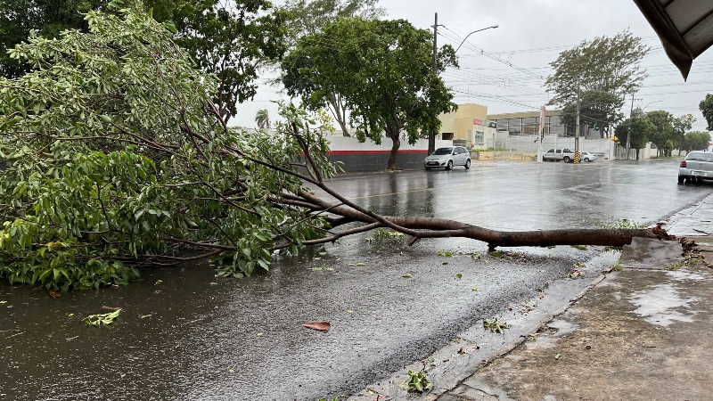 A força dos ventos derrubou a árvore na via pública. O trânsito não foi interrompido. Por ser uma via larga, os veículos desviavam, na passagem pelo local.