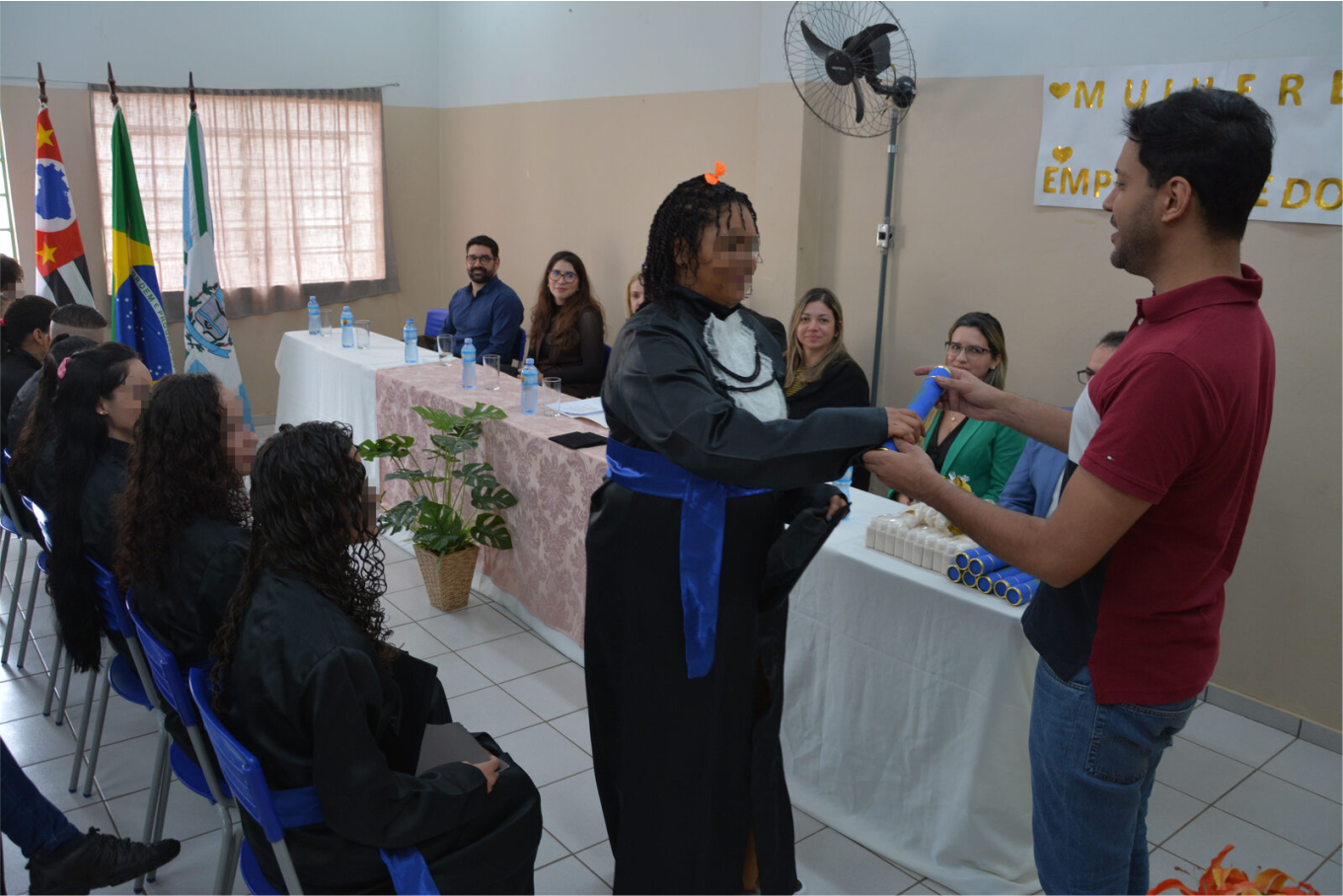 A solenidade de entrega de certificados de conclusão do curso aconteceu no último dia 2, com a presença da Juíza de Direito da 1ª Vara da Comarca de Tupi Paulista, Maiara Leite Cardoso Kravchychyn; do Diretor de Atendimento e Promoção Humana da Fundação "Prof. Dr. Manoel Pedro Pimentel" (FUNAP), Alexandre Rodrigues Cabrera; do Diretor da ETEC Marcio Dimas Bini Filho; do Chefe de Divisão da Penitenciária Feminina, Eduardo Morello; da Chefe do Complexo Penal de Tupi Paulista, Adriana Alkmin Pereira Domingues e dos professores.