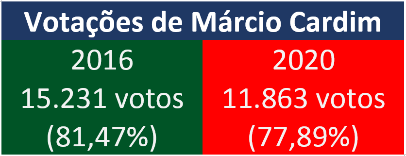Neste domingo, em sua reeleição, Márcio obteve um total de 11.863 votos (77,89%), o que repercute em 3.368 votos a menos, quando comparado à votação de 2016. Seu adversário, Marcos Lama, teve um desempenho melhor que o adversário anterior de Cardim. Lama obteve 3.367 votos, um total de 22,11% dos votos válidos. (Continua após a publicidade...)