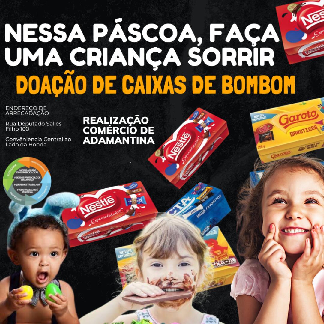 Uma nova mobilização social foi iniciada por representantes do comércio, em Adamantina. O foco agora visa arrecadar caixas de bombom, nesta semana da Páscoa, que serão doadas para crianças. A iniciativa recebeu o nome de “Nesta Páscoa, faça uma criança sorrir”. A entrega, às crianças, deve ocorrer no próximo fim de semana.