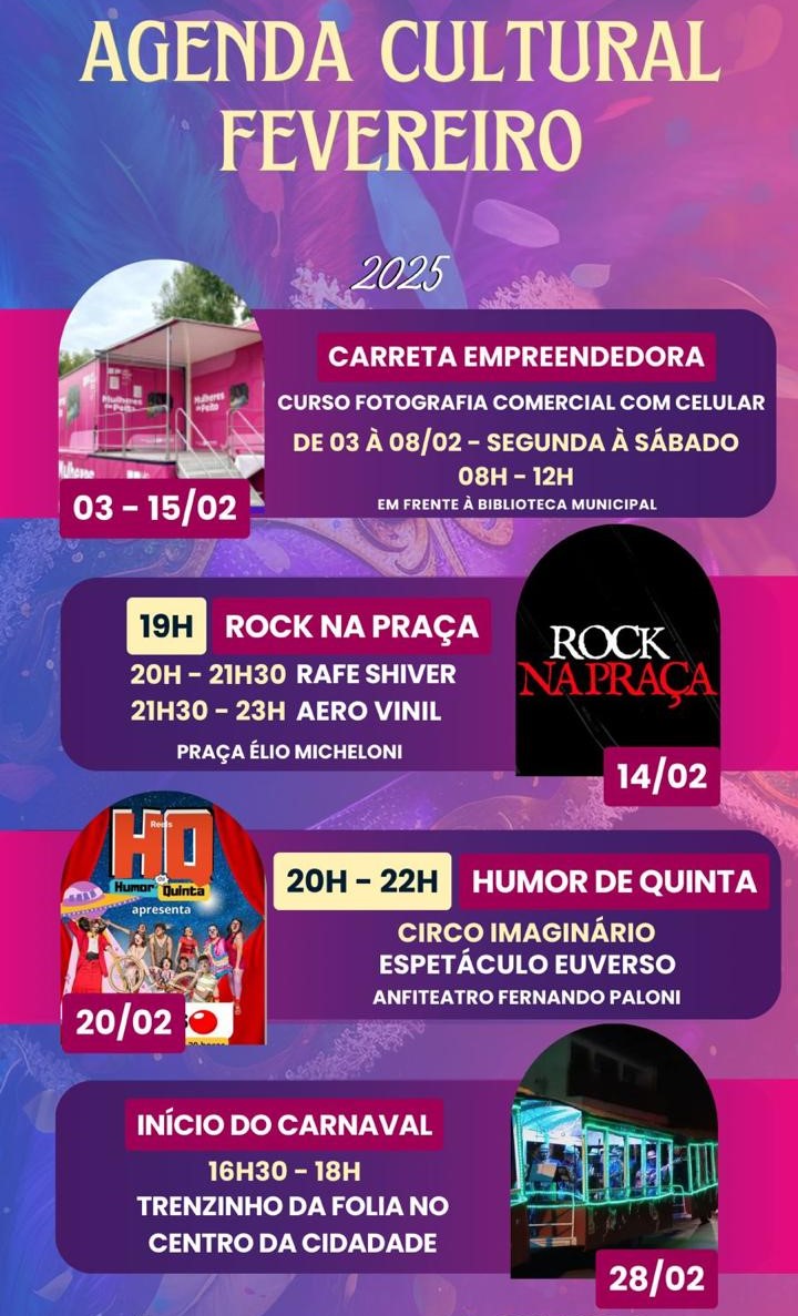 A Prefeitura de Adamantina, por meio da Secretaria de Cultura e Turismo, divulga a programação que integra a agenda cultural do mês de fevereiro. No dia 14 de fevereiro, acontecerá na Praça Elio Micheloni, a primeira edição de 2025 do Rock na Praça.