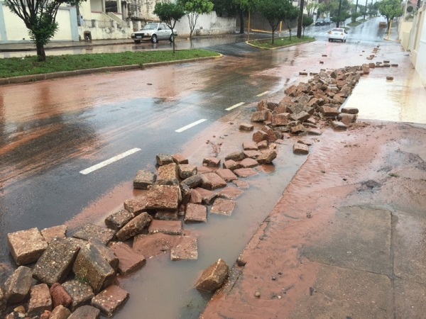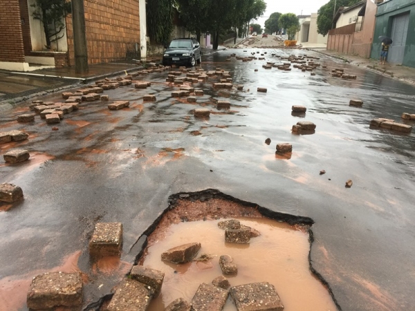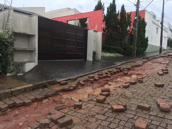 Com o volume concentrado de chuvas as enxurradas se formaram e ganharam força, arrancando as pedras da Rua Nove de Julho.