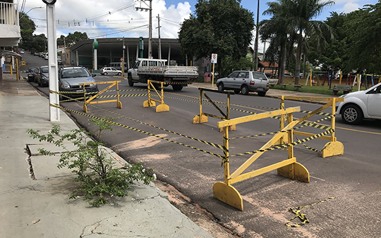 O afundamento do asfalto levou a Prefeitura a instalar cavaletes para restringir o acesso à área próxima à boca de lobo, atingindo parte da rua. O trânsito continua permitido no local.