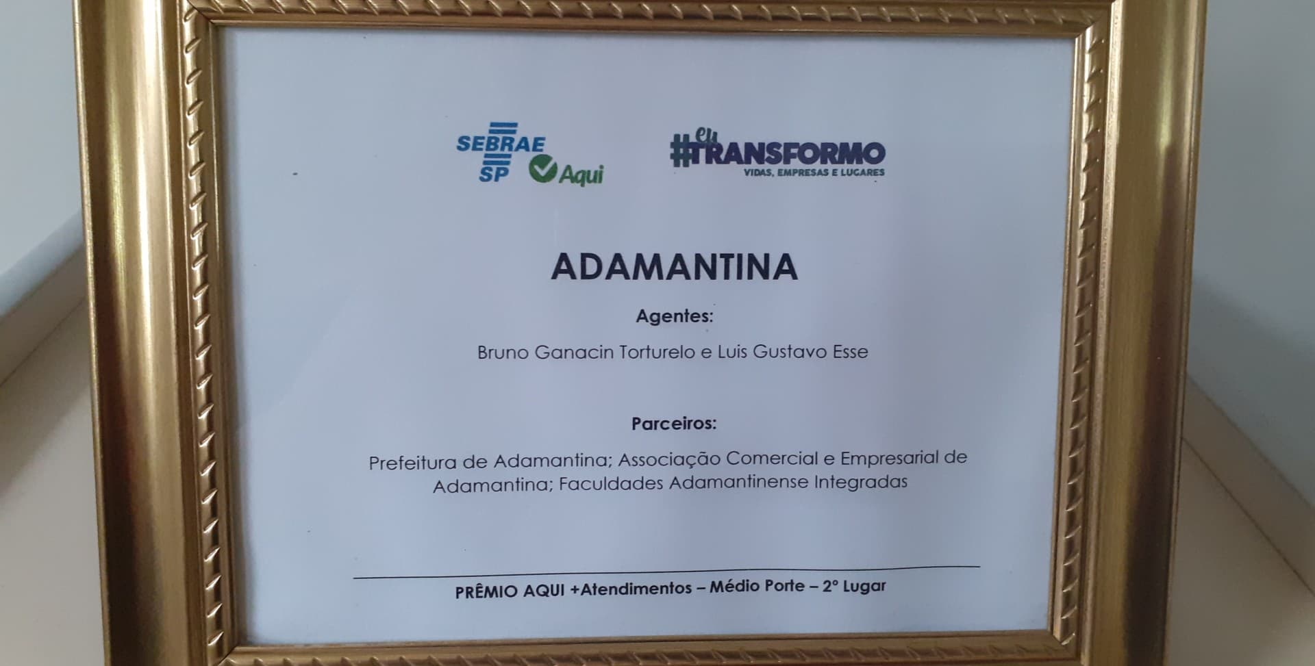 Inaugurado em 16 de dezembro de 2016, o Sebrae Aqui Adamantina representa o Sebrae-SP no município de Adamantina. Ele é mantido através de um convênio firmado entre a Prefeitura Municipal de Adamantina, a Associação Comercial e Empresarial de Adamantina (ACE) e o Centro Universitário de Adamantina (UniFAI).