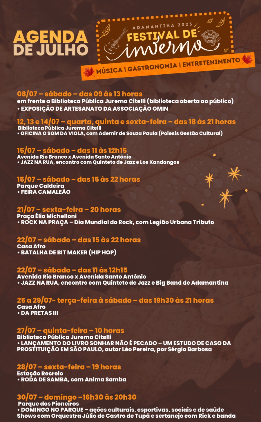 A programação promovida pela Prefeitura de Adamantina, por meio da Secretaria de Cultura e Turismo, no mês de julho vai mesclar música, gastronomia e entretenimento em meio ao Festival de Inverno.