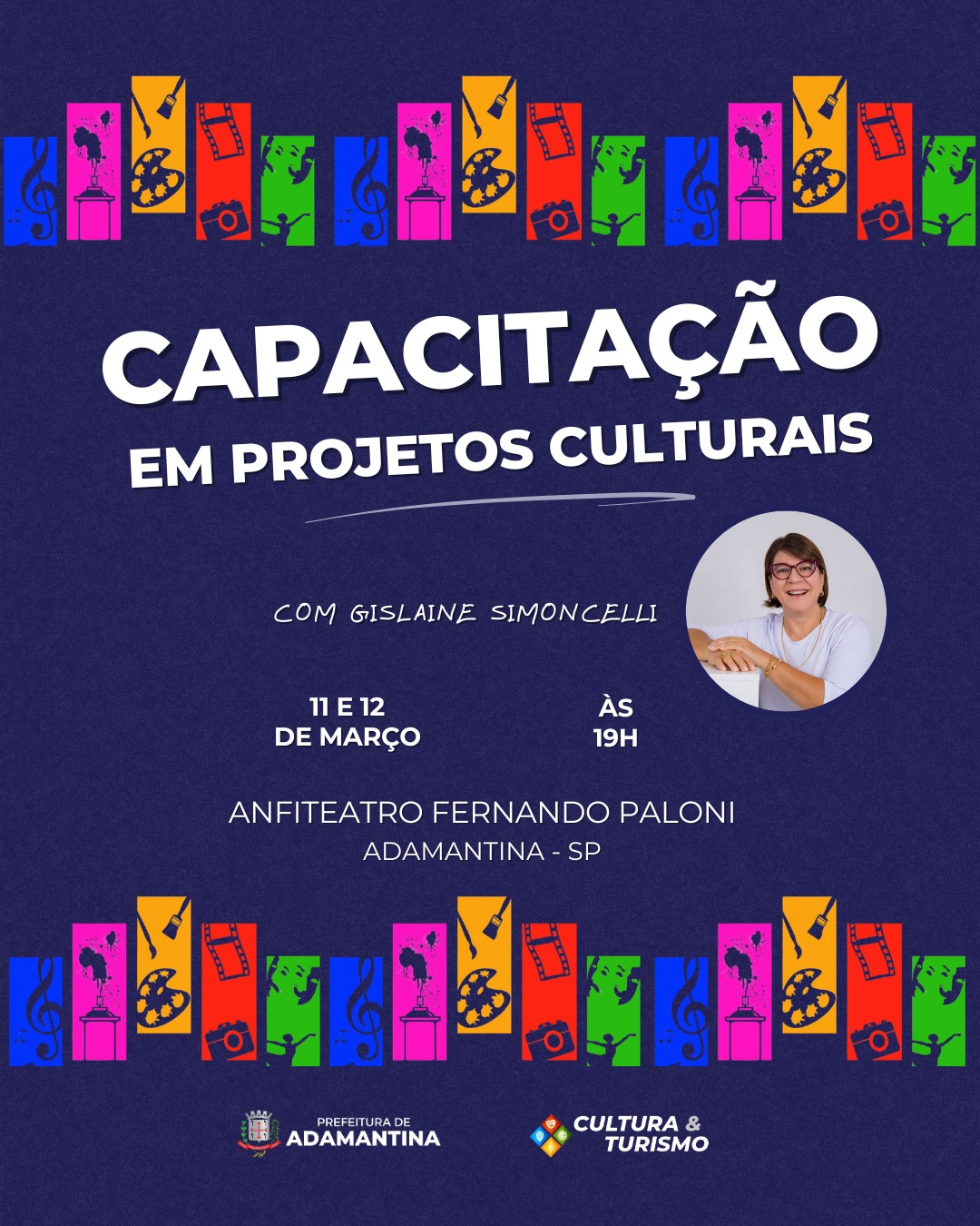 Nesta quarta (11) e quinta-feira (12) a partir das 19h no anfiteatro Fernando Paloni, a Prefeitura de Adamantina, por meio da Secretaria de Cultura e Turismo, realiza uma capacitação em projetos culturais. Para participar, não é necessário efetuar inscrição prévia.