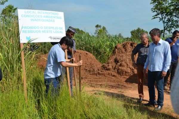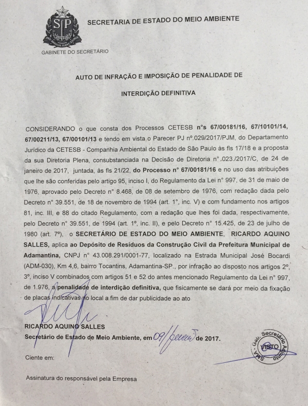Hoje, Cardim recepcionou o Secretário e foi notificado no local, sobre a interdição definitiva. Além de assinar o documento, o local recebeu uma placa instalada pela própria CETESB e teve seu acesso impedido com o depósito de terras, na sua entrada.